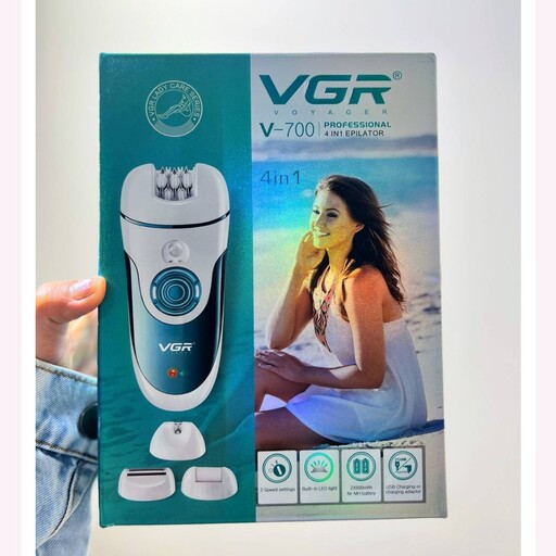 داشتن یک اپیلاتور که بتواند موهای بدن را با سرعت زیاد از ریشه جدا کند میتواند مورد علاقه بسیاری از خانمها قرار گیرد. دستگاه اپیلاتورV-700 که توسط شرکت وی جی ار تولید شده است میتواند با یک بار قرار گرفتن آن روی پوست تعداد زیادی از موها را از ریشه جدا کند. برای این اپیلاتور تنها باتری قابل شارژ به عنوان منبع تغذیه در نظر گرفته شده است. علاوهبر سری اپیلاتور، سری کوچک برای جدا کردن موهای مربوط به مناطق محدود وجود دارد که نیاز فرد را از خرید دستگاهی جداگانه برای اصلاح این مناطق بر طرف کرده است. از آنجاییکه این مدل قابلیت شارژ شدن را دارد میتوان از آن پس از 8ساعت شارژ کامل به مدت60 دقیقه استفاده کرد. با استفاده از برس تمیز کننده که برای این اپیلاتور به عنوان اقلام همراه در نظر گرفته شده میتوان دستگاه را پس از اصلاح بهراحتی تمیز کرد. کالا 4 سری، برس تمیز کننده،آداپتور دارد