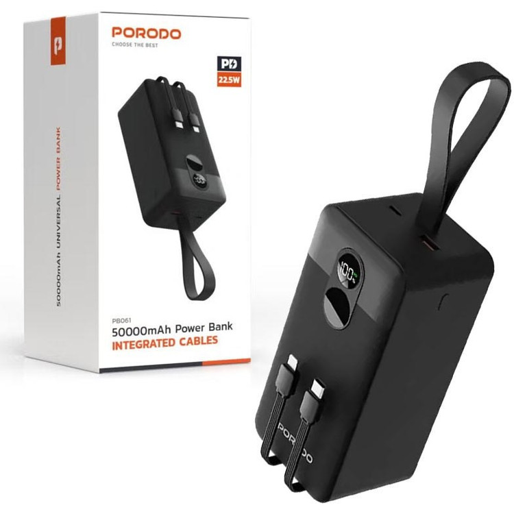 با پاوربانک Porodo 50000mAh یکپارچه کابلهای مشکی همراه باشید که ظرفیت و قابلیت شارژ عالی برای همه دستگاههای شما دارد. اکثر پاوربانکها دارای چنین ظرفیتی هستند و از باتری عظیم 50000 میلیآمپر ساعتی (185 وات ساعت، 3.7 ولت) بهره میبرند که آن را به یک موتور کاملاً مطمئن تبدیل میکند.