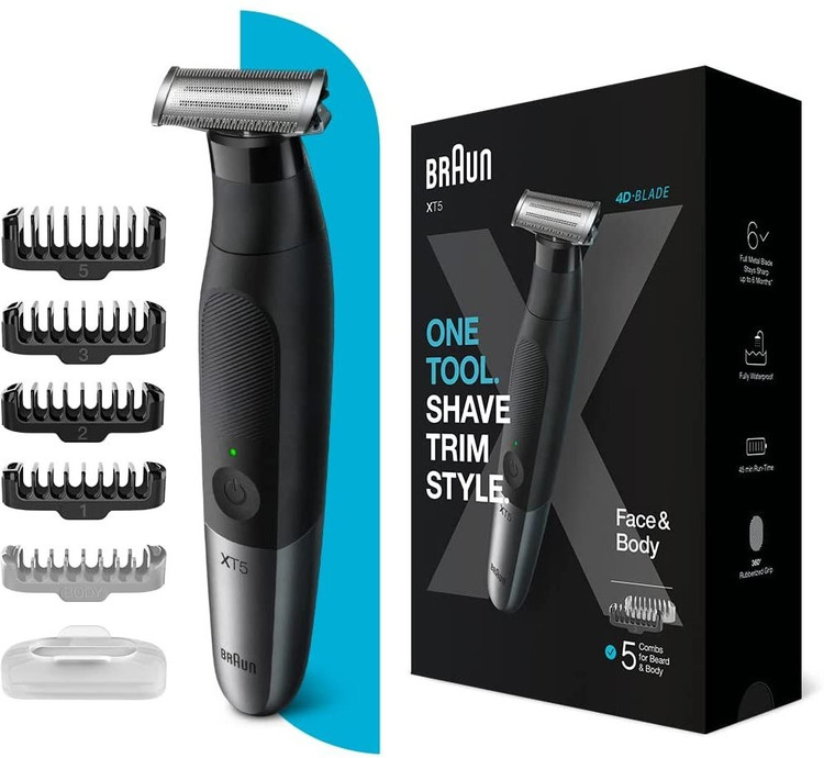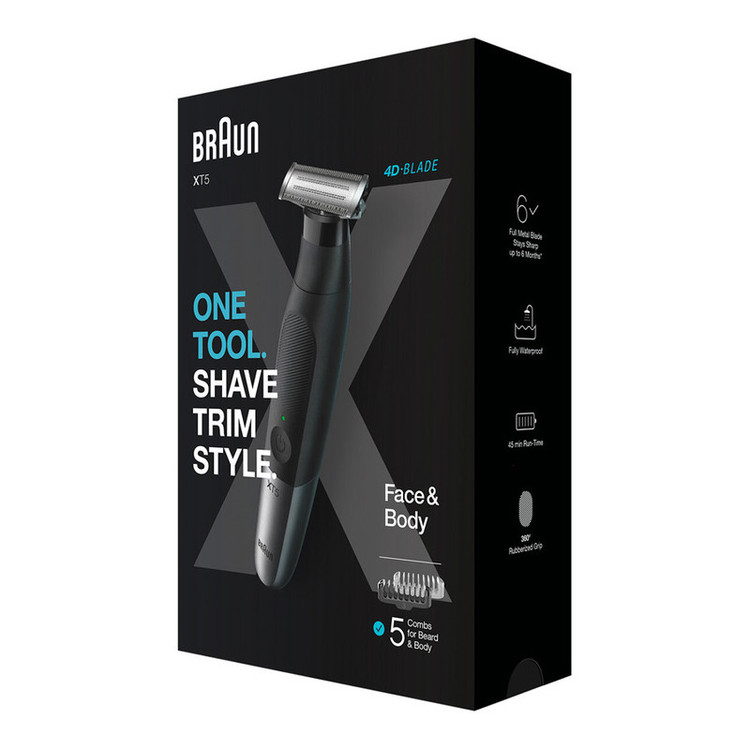 ماشین اصلاح براون مدل XT5100 مناسب برای اصلاح ریش و بدن است. تیغه 4 بعدی آن یک اصلاح آسان ، راحت و ملایم را ارائه میدهد. این ماشین اصلاح و ریش تراش 100% ضد آب بوده و میتوان به صورت مرطوب(زیر دوشی) ، خشک یا به همراه فوم و ژل اصلاح استفاده کرد. شما میتوانید به سبب طراحی باریک ، دستگیره ضد لغزش و تیغه 4 بعدی، اصلاحی دقیق، ظریف و آسان را تجربه کنید. تیغه این دستگاه دارای فناوری 4D-Blade که یک تیغه با 4 عنصر برش، متشکل از 2 دستگاه اصلاح جانبی و 2 منطقه اصلاح مرکزی است و 450 حرکت در ثانیه انجام میدهد. به سبب این فناوری نوین شما میتوانید بالاترین ظرافت اصلاح را تجربه کنید. انعطاف پذیری سری این دستگاه سبب اصلاحی بدون نقص در تمامی زوایای صورت و بدن میشود. این دستگاه دارای 5 عدد شانه به شمارههای 1،2،3،5 میلی متر برای صورت و شماره 0 میلی متر برای بدن است.