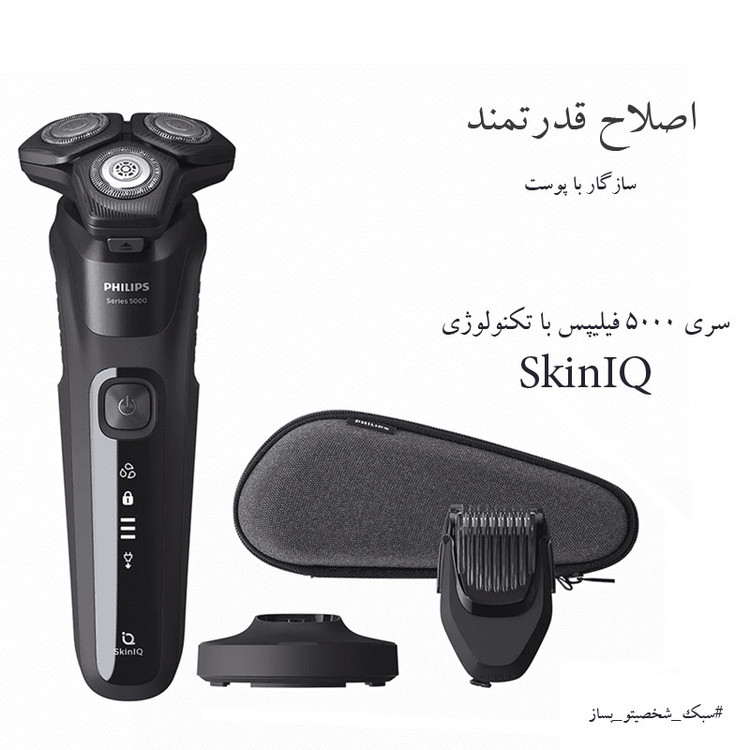 فیلیپس در طراحی ریش تراش های جدید خود از تکنولوژی SkinIQ بهره برده است . این تکنولوژی این قابلیت را داراست که متناسب با نوع پوست و ضخامت ریش هر شخص دور موتور را تنظیم کند تا کاربر بهترین و منطبق ترین اصلاح با پوست را تجربه کند . S5898/38 از تولیدات جدید شرکت فیلیپس و از سری 5000 این کمپانی خوش نام می باشد که کاملا ضد آب بوده و قابلیت اصلاح بصورت خشک یا مرطوب را به شما می دهد . باتری لیتیوم یون قدرتمند این دستگاه در مدت 60 دقیقه شارژ می شود و پس از شارژ کامل به مدت 50 دقیقه (معادل 17 اصلاح) بصورت مداوم اصلاح میکند . 45 تیغه بکار رفته در این ریش تراش در سه سری مختلف قرار گرفته و با بهترین کیفیت روز دنیا ساخته شده و با 90000 دور چرخش در دقیقه هیچ مویی از صورت شانس جا ماندن روی صورت شما پیدا نمی کند . همچنین این تیغه ها از جنس استیل ضد زنگ و خودتیز شونده می باشند که یک مزیت بسیار عالی نسبت به مدلهای قدیمی سری 5000 می باشد . خط زن این دستگاه هم بر خلاف مدلهای قدیمی 5000 در قسمت پشت آن واقع شده و استفاده از آن را ساده تر از پیش کرده است .یکی از قابلیت های بسیار خوب و کاربردی S5898/38 سری تریمر این مدل می باشد که قابلیت اصلاح ته ریش را به کاربر می دهد بنابراین شما قادر خواهید بود علاوه بر اصلاح صفر ، اصلاح ته ریش را نیز با این مدل تجربه کنید . بهمراه دستگاه استند شارژ و یک کیف مسافرتی بسیار شیک و با کیفیت نیز ارائه شده است . S5898/38 طراحی و ساخته شده در کشور هلند می باشد .
